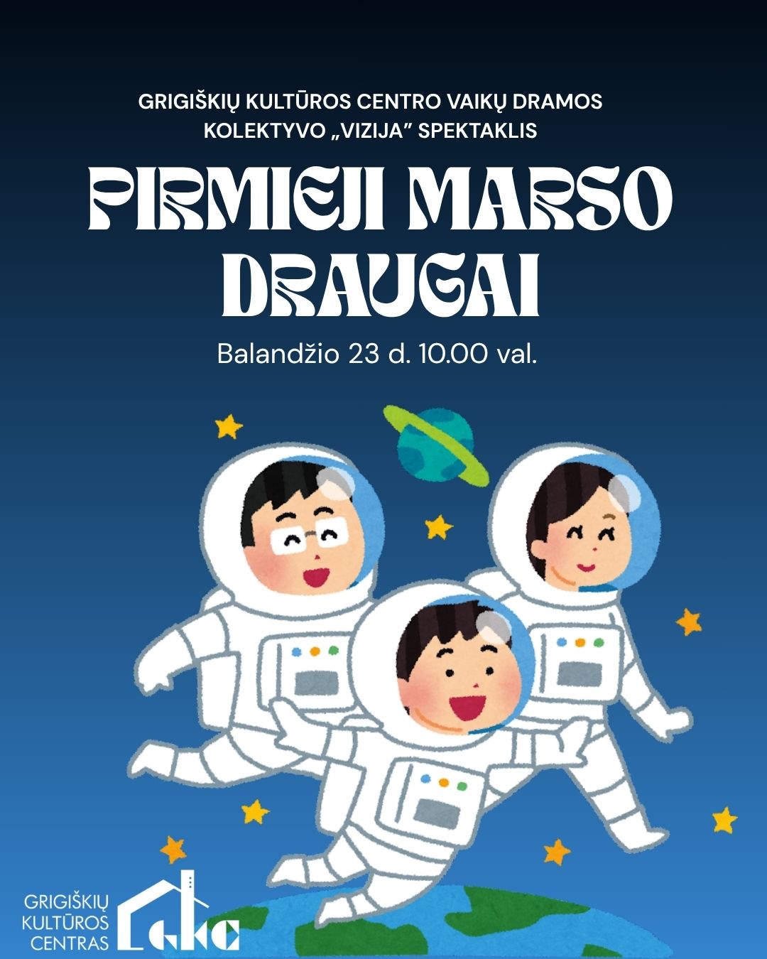 Grigiškių kultūros centro vaikų dramos kolektyvas „Vizija“ (vad. Danutė Umbrasienė) kviečia priešmokyklinio amžiaus ir 1–2 klasių vaikus į naują spektaklį „Pirmieji Marso draugai“