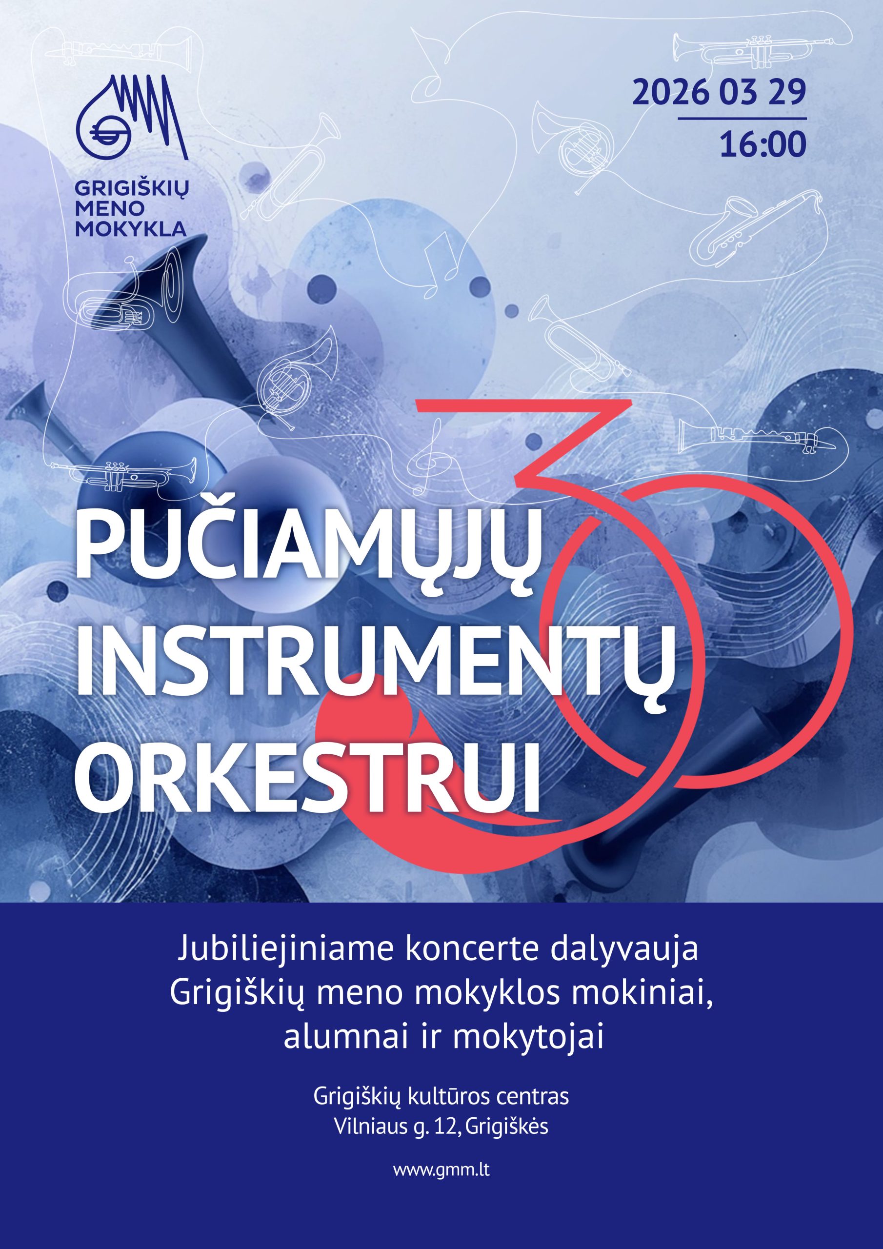 Kviečiame į jubiliejinį koncertą, skirtą Grigiškių meno mokyklos pučiamųjų instrumentų orkestro 30-mečiui paminėti. Koncertas vyks 2026 m. kovo 29 d. (sekmadienį) 16 val. Grigiškių kultūros centre.